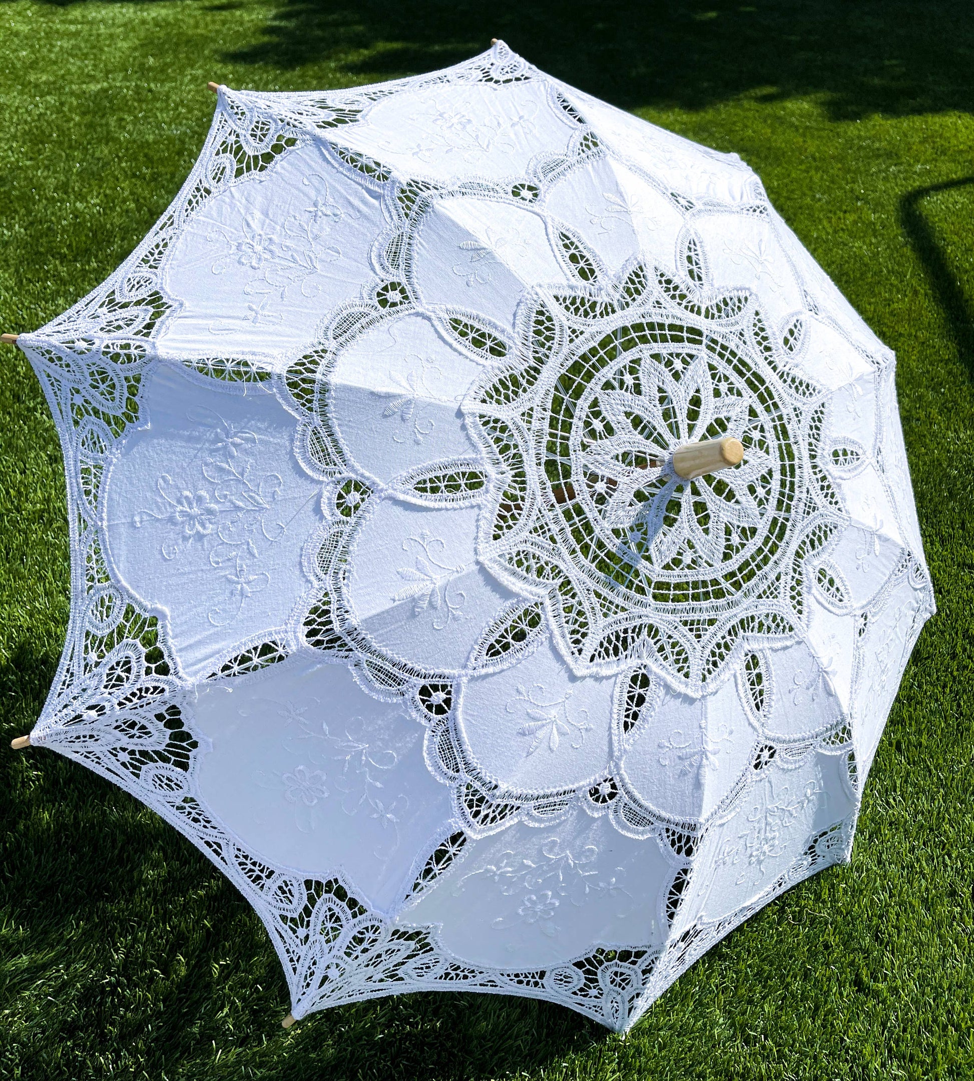 Our Battenberg lace parasol with bamboo handle has beautiful Victorian styled lace with a romantic lace pattern. The decorative parasol measures approximately 26" tall (handle to top) and has a diameter of 29". The parasol is perfect for wedding favors, decorations, photo props, bridal shower gift, and bridesmaid gifts.