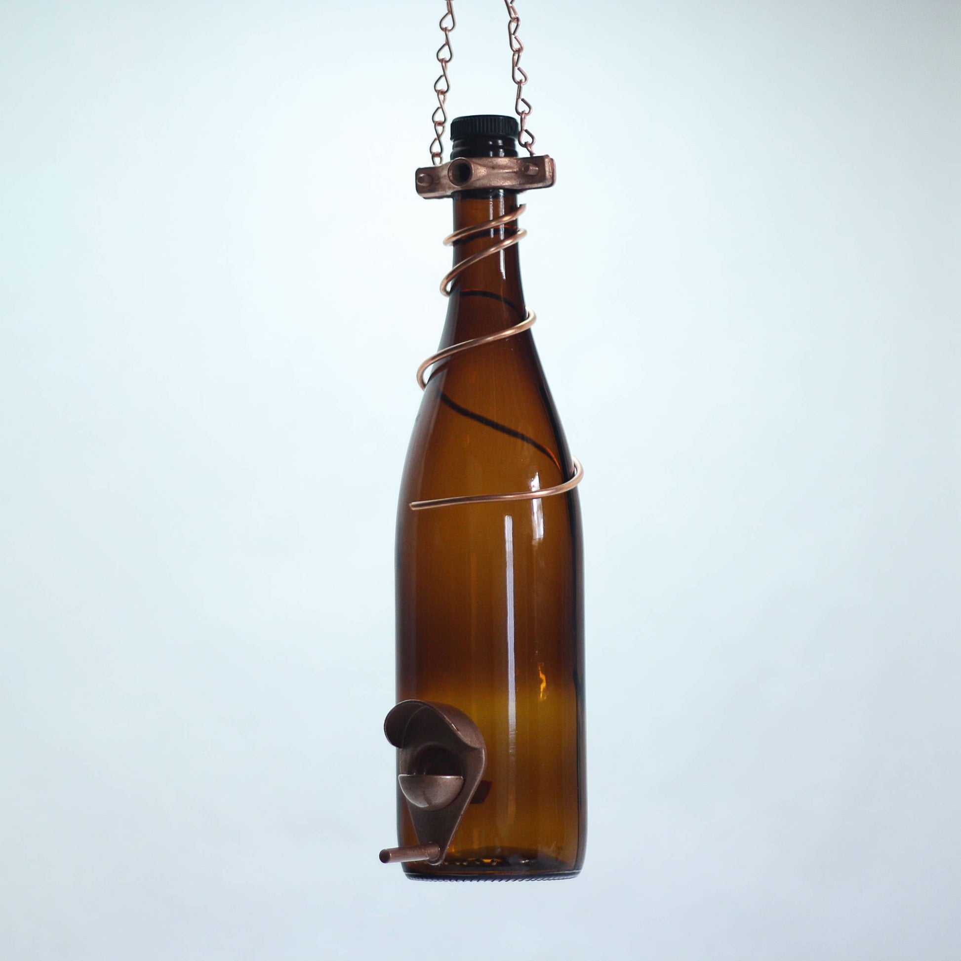 - One (1) glass wine bottle bird feeder, color and trim selected. Bottle size: 12” tall, Total hanging length: 16”
