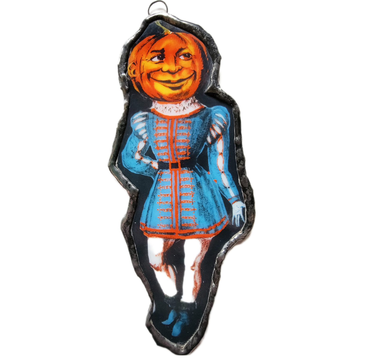 Standing 6 inches high, this guy knows how to flaunt his best angles! He is hand enameled onto white translucent glass, kiln fired and finished with a soldered, patinaed frame.