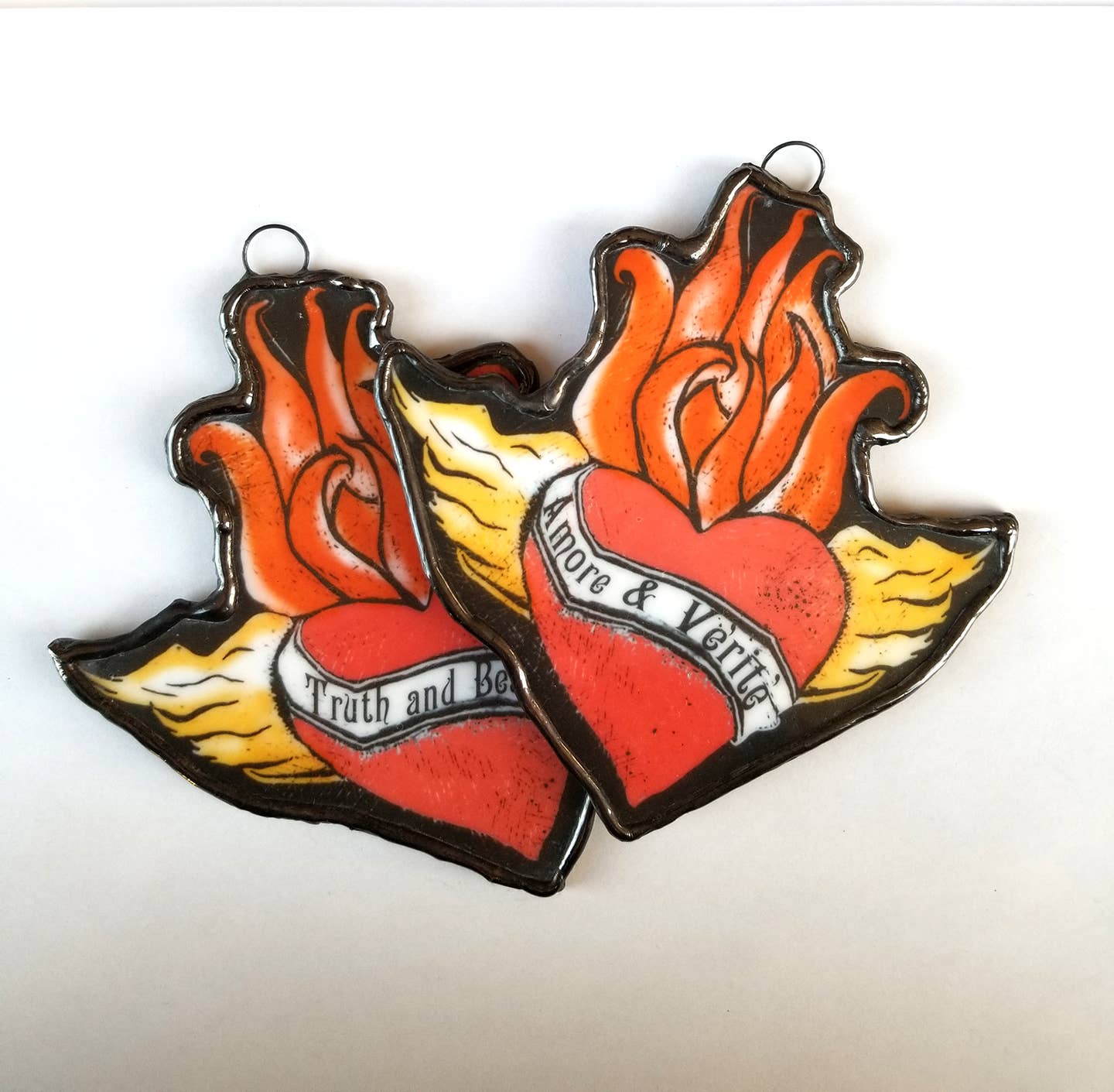 Love and Truth! Truth and Beauty! What's your creed? These hand illustrated sacred hearts are enameled onto white milk glass and ready to hang, a perfect way to remind yourself to focus on the important things! This two pack has one of each creedo and a bit of savings.